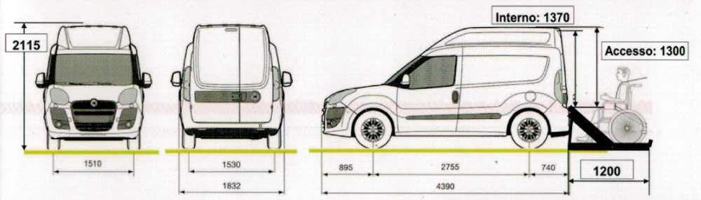 La misura di larghezza di 1832 millimetri corrisponde alla larghezza della fiat doblò 2015 senza specchietti retrovisori esterni... Il veicolo presenta una lunghezza esterna da 4,40 a 4,98 metri in base alla versione, con una larghezza da 1,83 a 1,87 metri, un'altezza esterna da 1,85 a 2,13 metri e un passo corto o lungo da 2,76 a 3,10 metri.